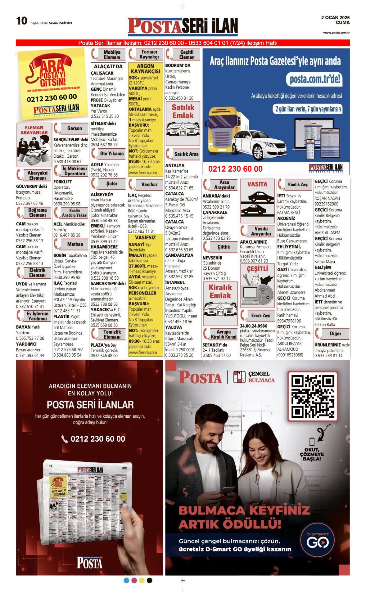 Posta Bugünkü İş İlanları, Posta Eleman, Posta Kayıp İlanı-2.1.2026
