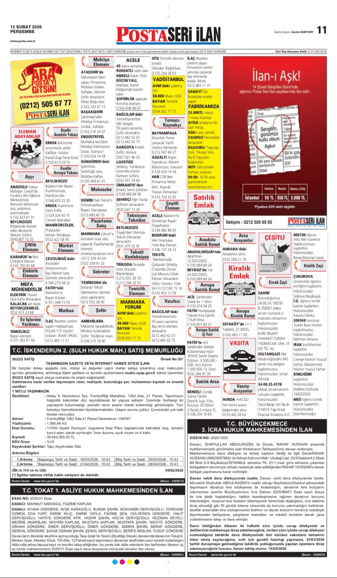 Posta Bugünkü İş İlanları, Posta Eleman, Posta Kayıp İlanı, Posta Seri İlanlar-12.2.2026