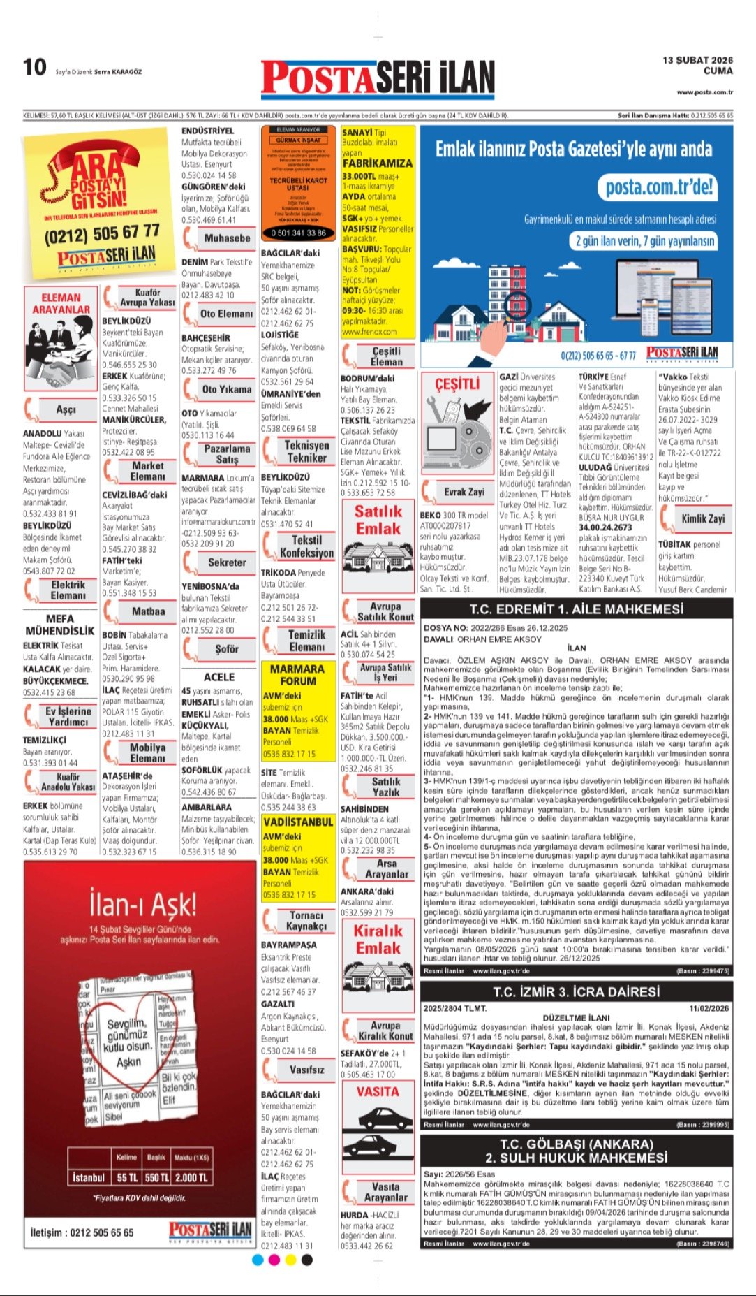 Posta Bugünkü İş İlanları, Posta Eleman, Posta Kayıp İlanı, Posta Seri İlanlar-13.2.2026