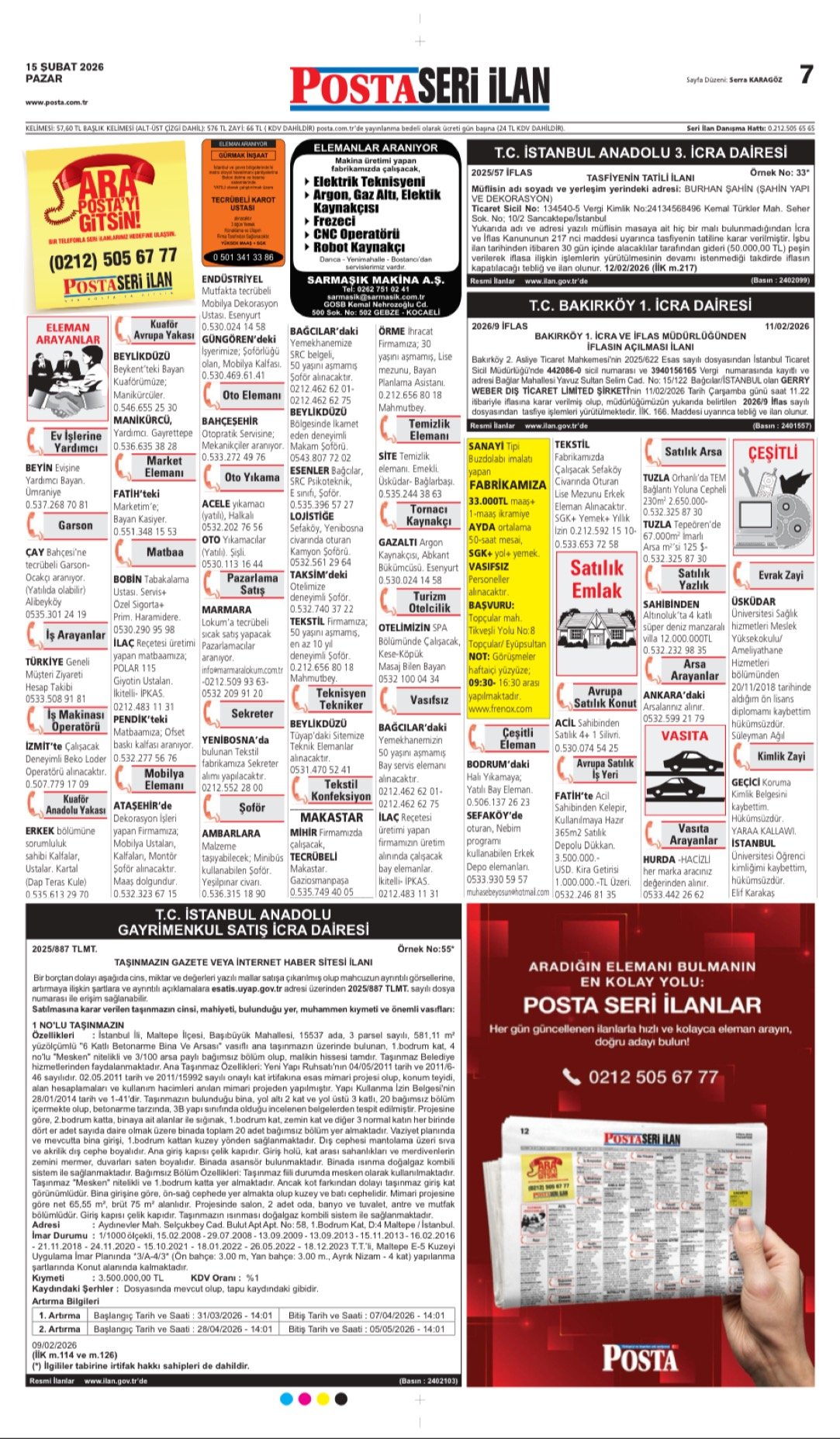 Posta Bugünkü İş İlanları, Posta Eleman, Posta Kayıp İlanı, Posta Seri İlanlar-15.2.2026