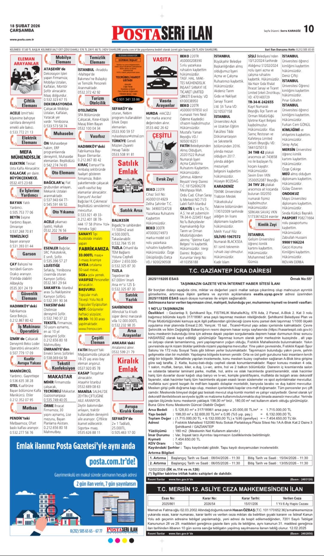 Posta Bugünkü İş İlanları, Posta Eleman, Posta Kayıp İlanı, Posta Seri İlanlar-18.2.2026