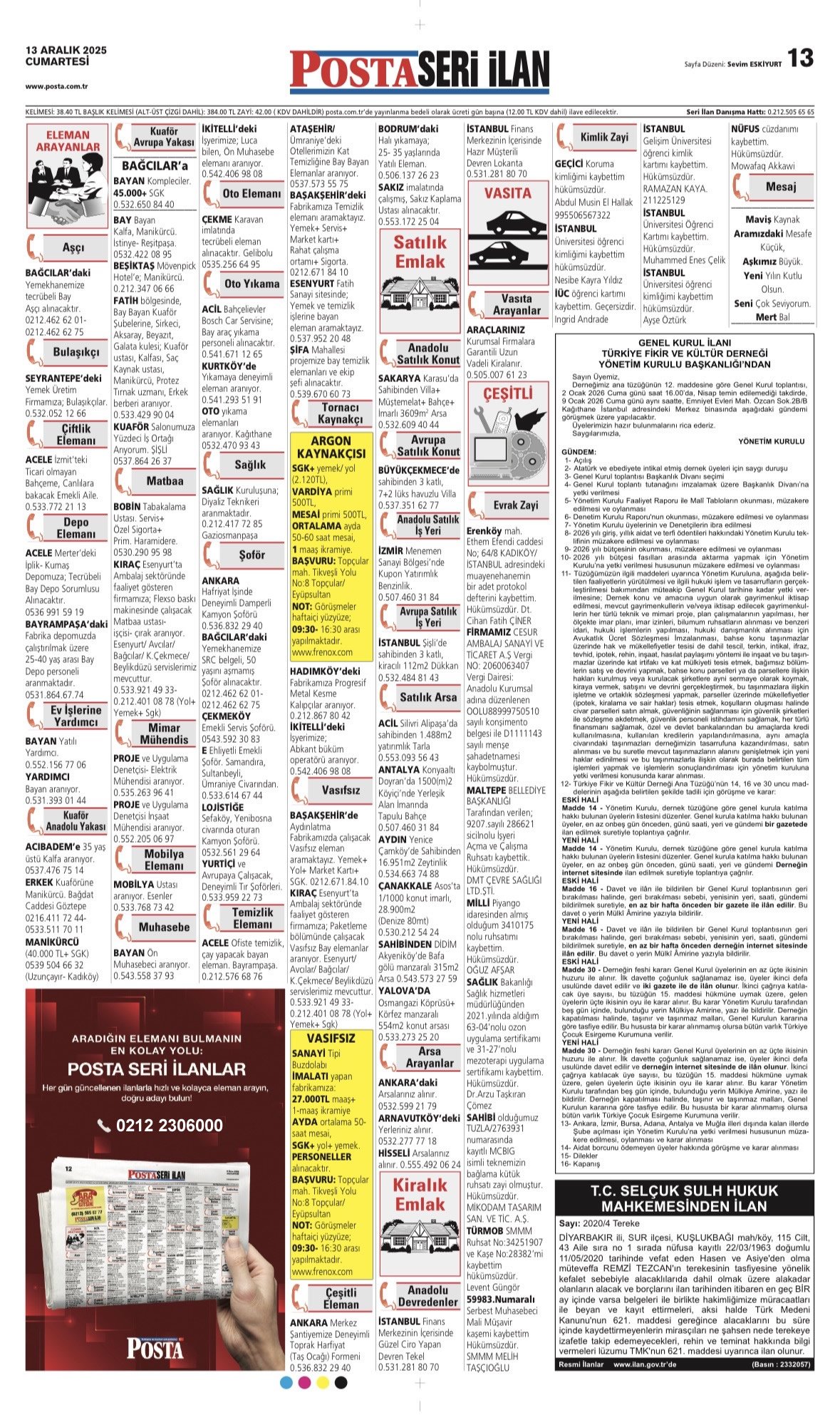 Posta Bugünkü İş İlanları, Posta Eleman, Posta Kayıp İlanı-13.12.2025