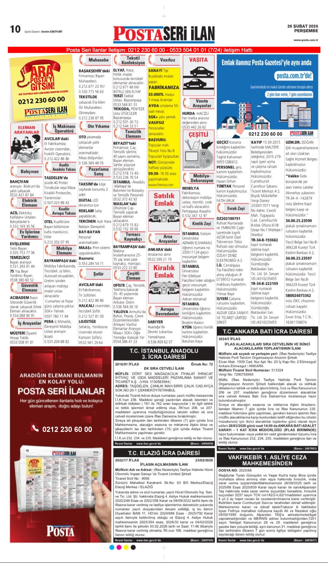 Posta Bugünkü İş İlanları, Posta Eleman, Posta Kayıp İlanı, Posta Seri İlanlar-26.2.2026