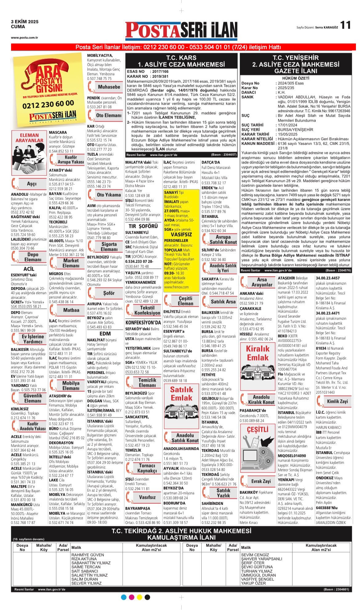 POSTA GAZETESİ SERİ İLAN SERVİSİ | www.seriilanposta.com | 0212 230 60 00 - 0533 504 01 01 (7/24) İlan Hattı
