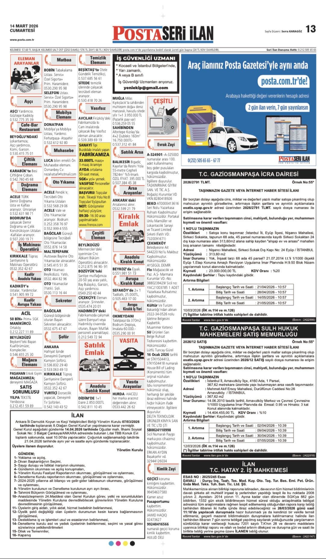 Posta Bugünkü İş İlanları, Posta Eleman, Posta Kayıp İlanı, Posta Seri İlanlar-14.3.2026