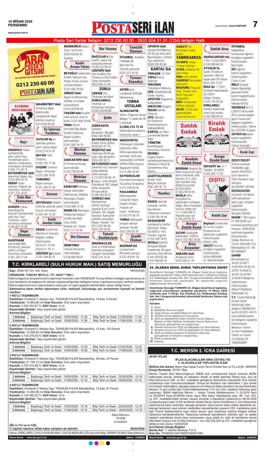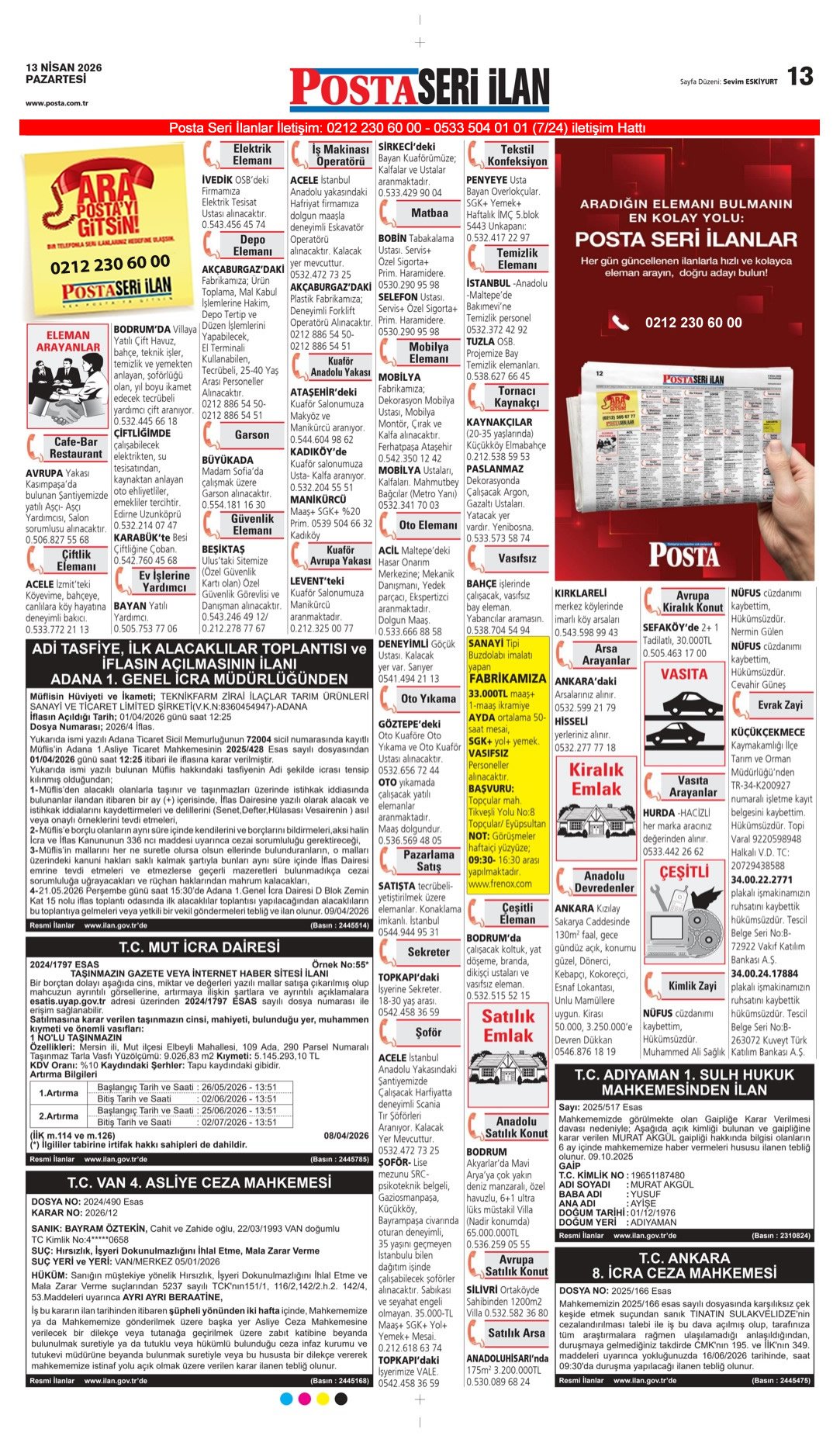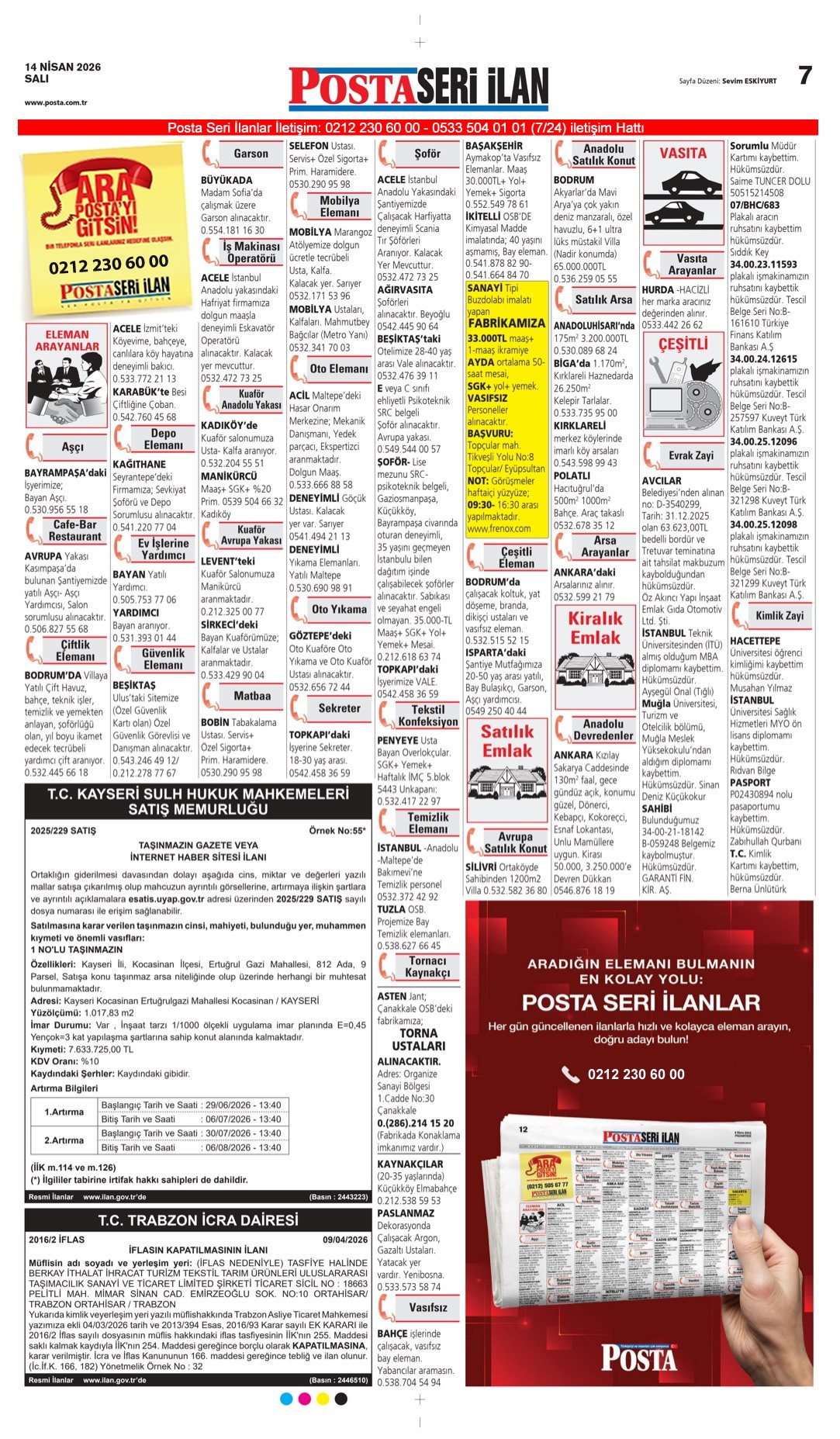 Posta Bugünkü İş İlanları, Posta Eleman, Posta Kayıp İlanı, Posta Seri İlanlar-25.2.2026