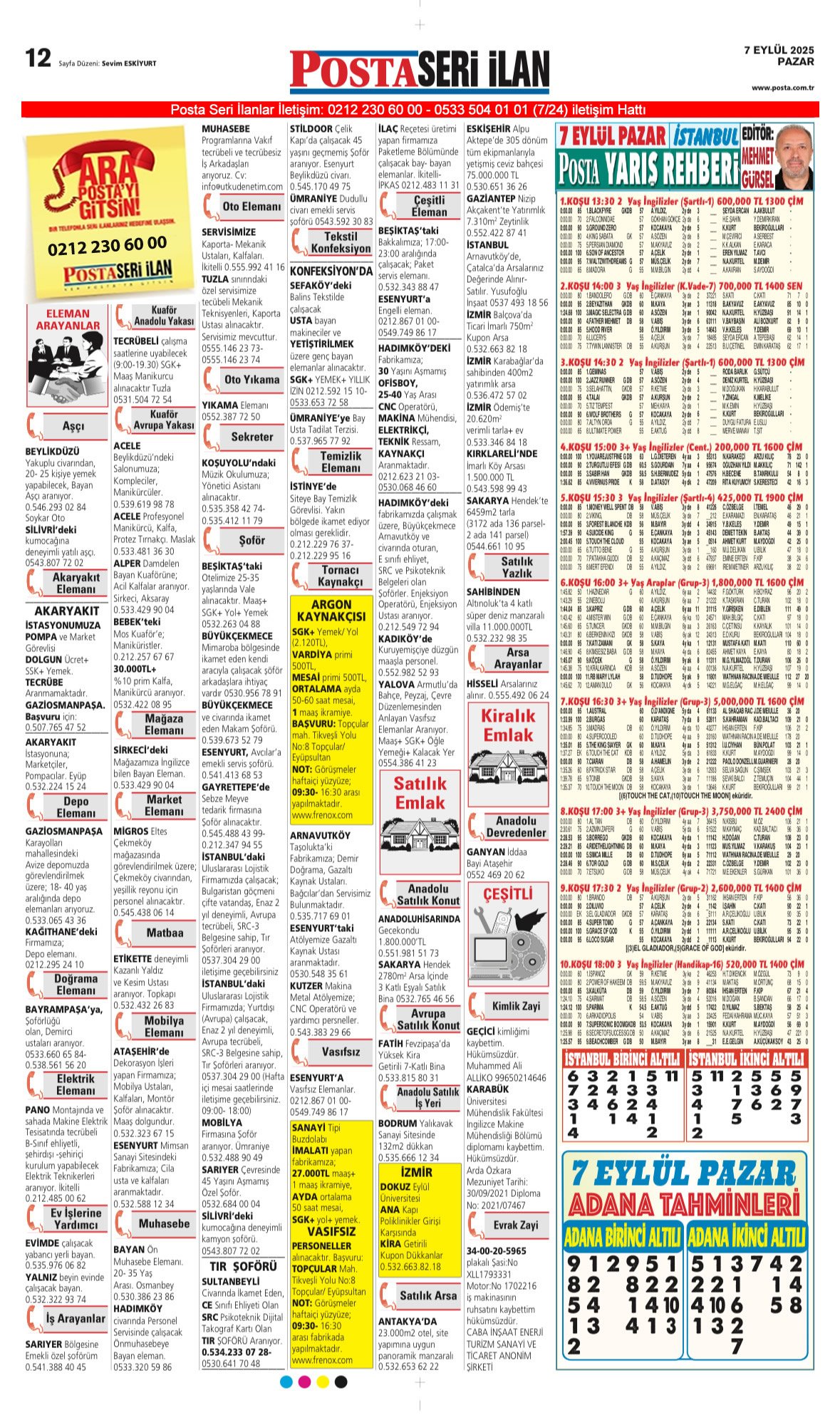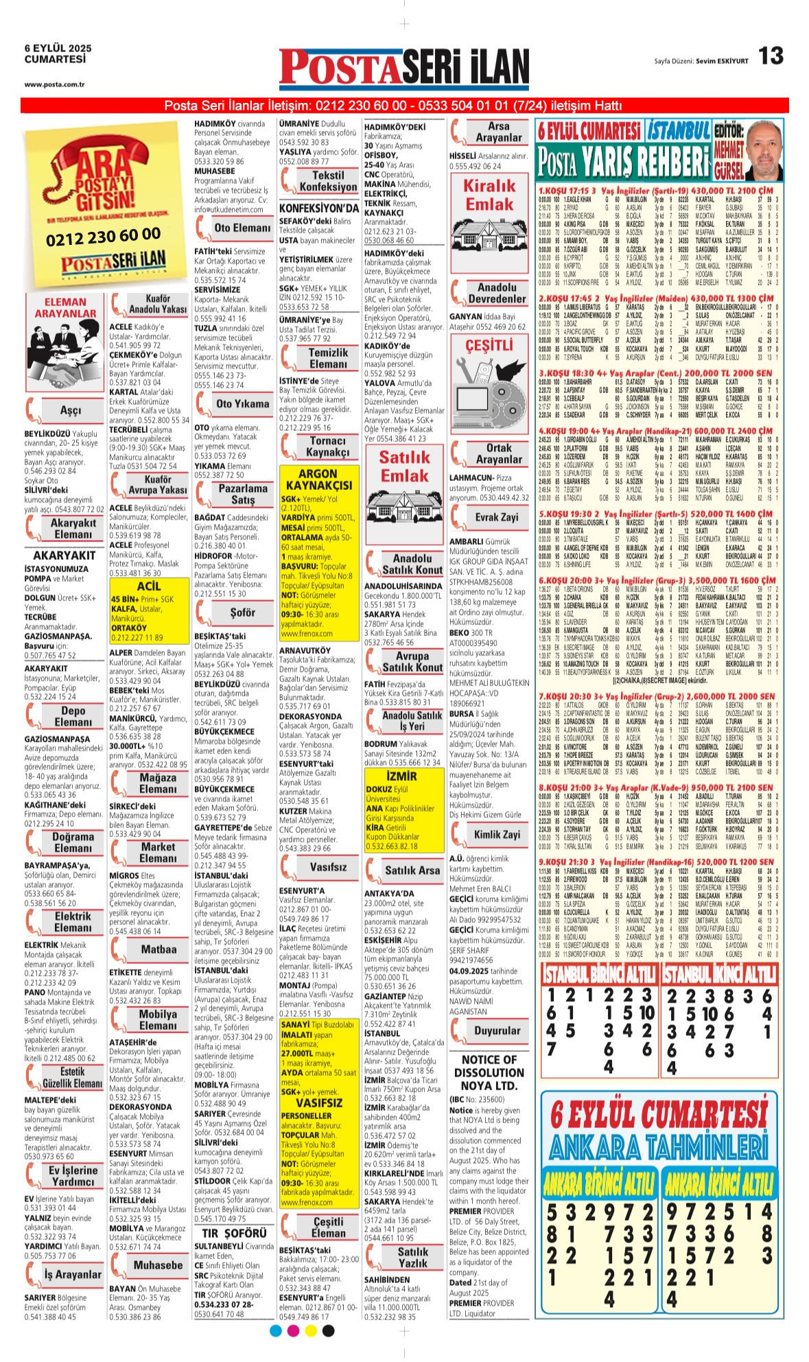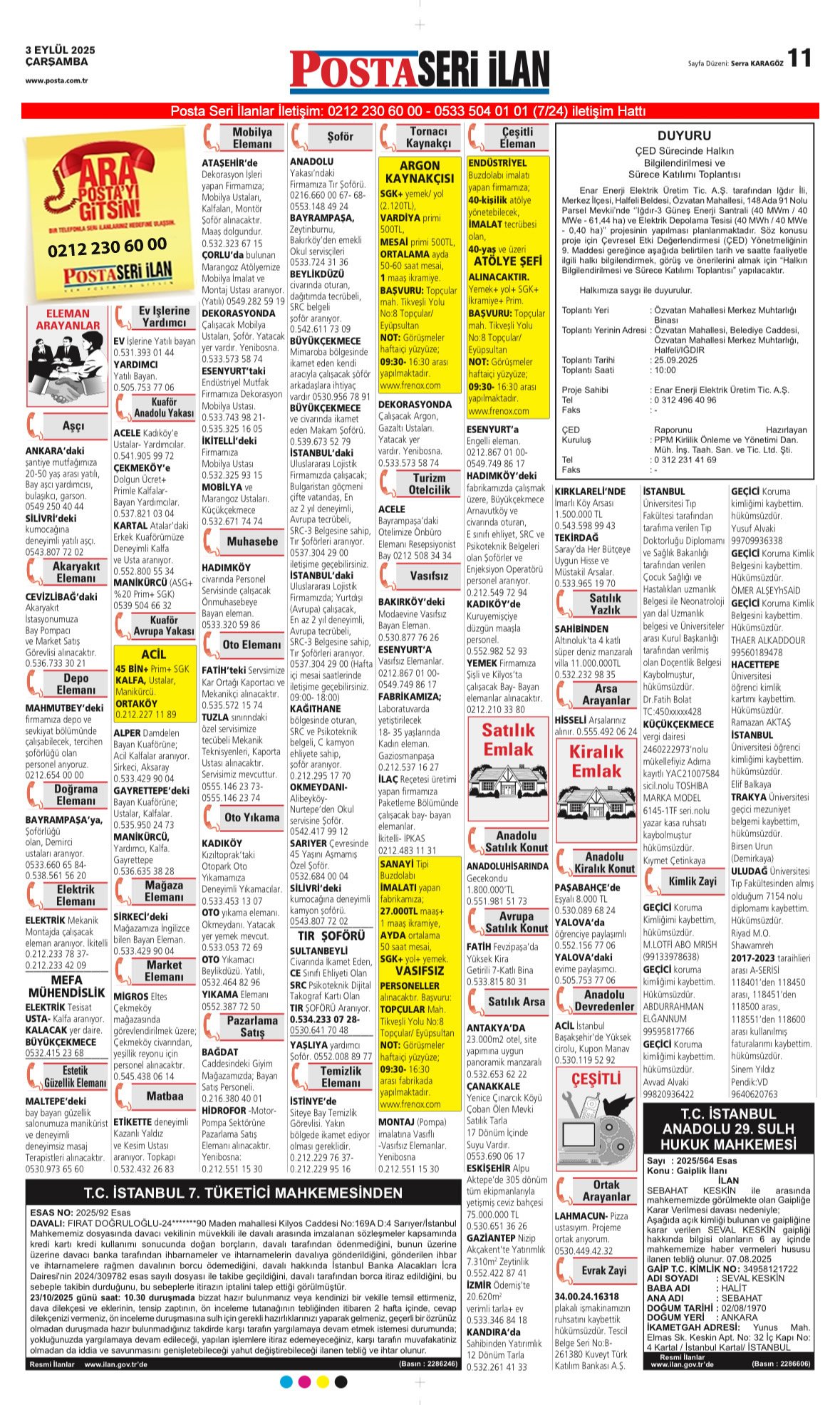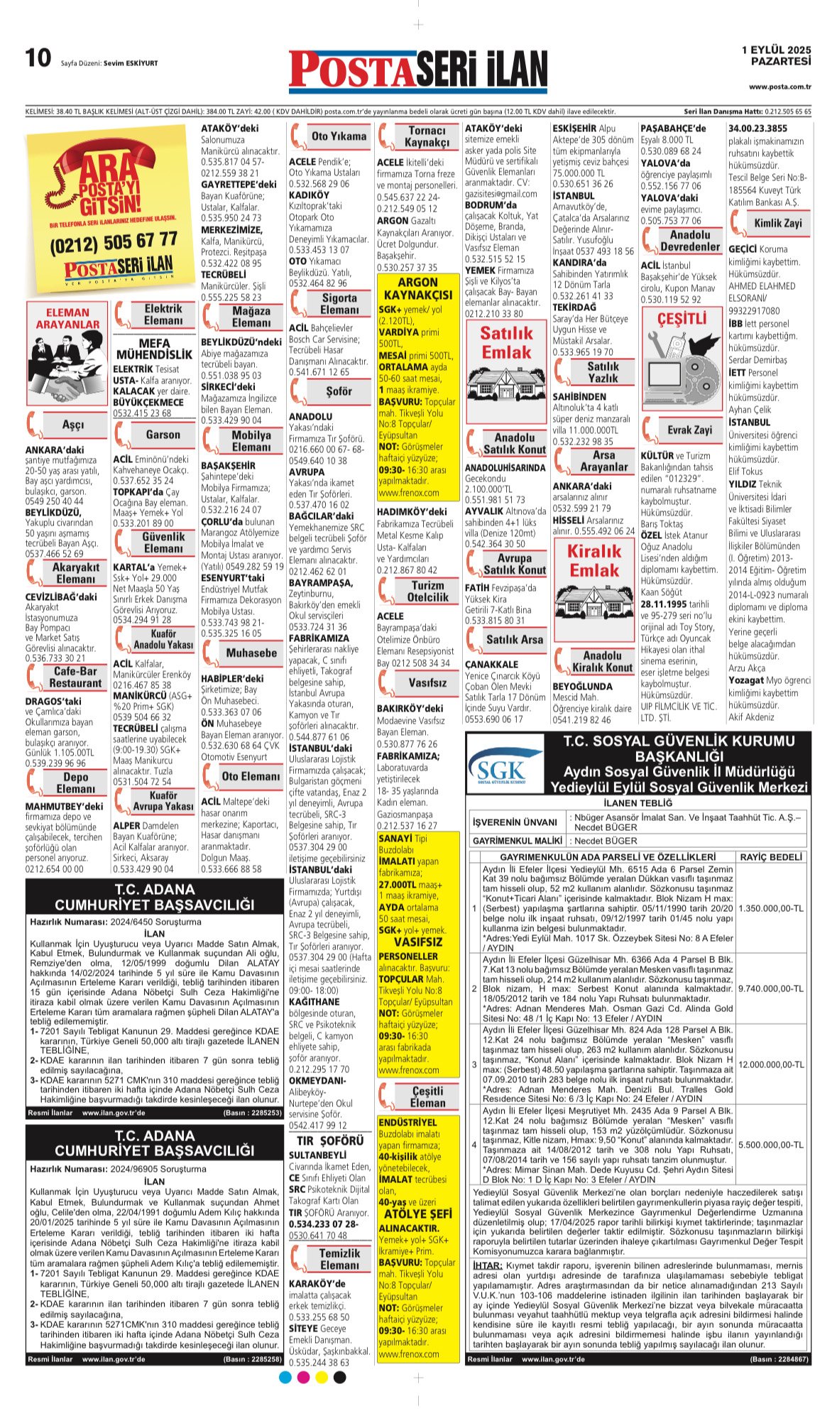 Posta Bugünkü Seri İlanlar- Eleman- Emlak- Vasıta- Kayıp İlan-3.9.2025