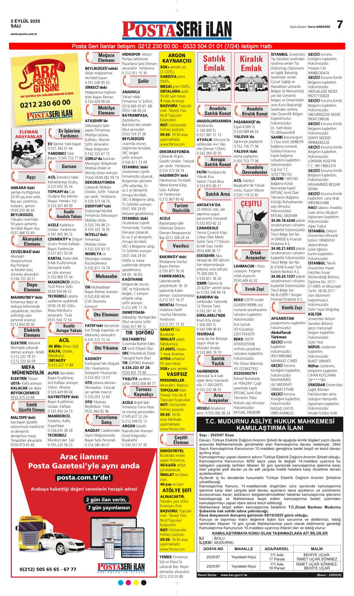 Posta Bugünkü Seri İlanlar- Eleman- Emlak- Vasıta- Kayıp İlan-2.9.2025