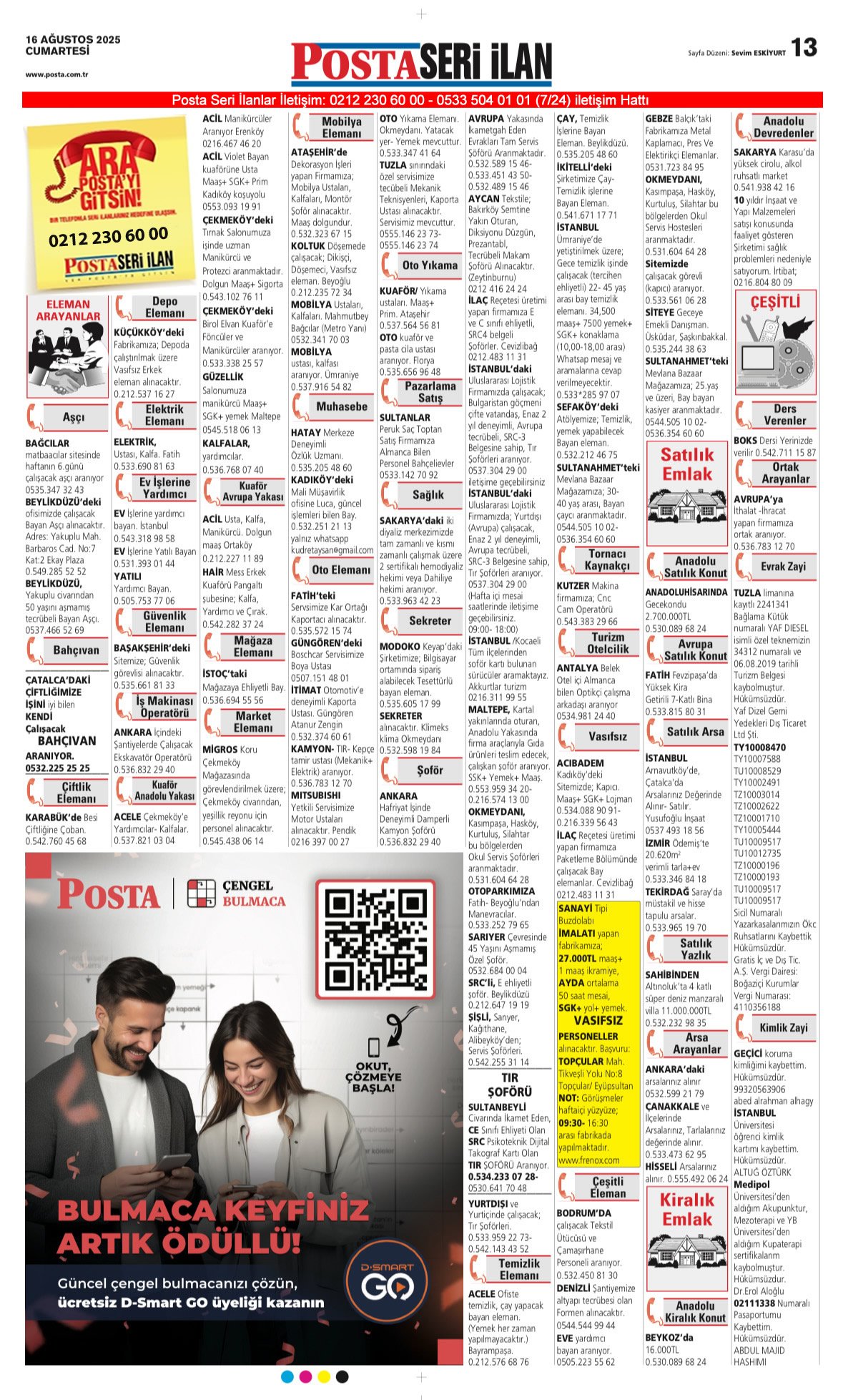 Posta Bugünkü Seri İlanlar- Eleman- Emlak- Vasıta- Kayıp İlan-16.8.2025