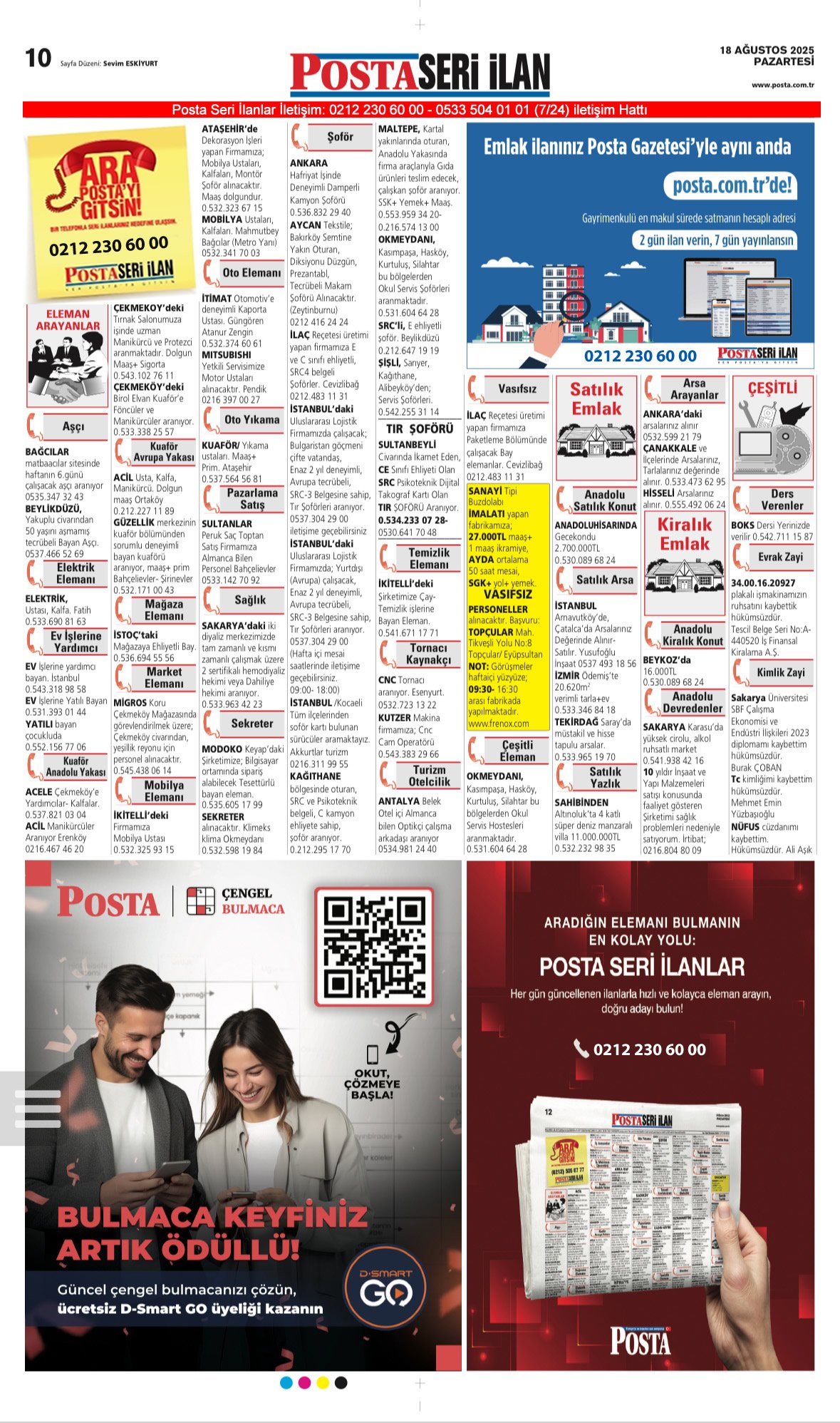 Posta Bugünkü Seri İlanlar- Eleman- Emlak- Vasıta- Kayıp İlan-18.8.2025