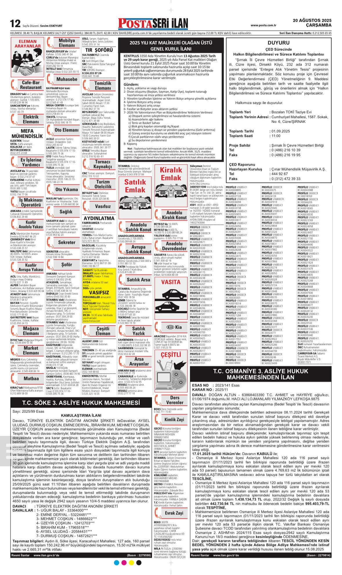 Posta Bugünkü Seri İlanlar- Eleman- Emlak- Vasıta- Kayıp İlan-20.8.2025