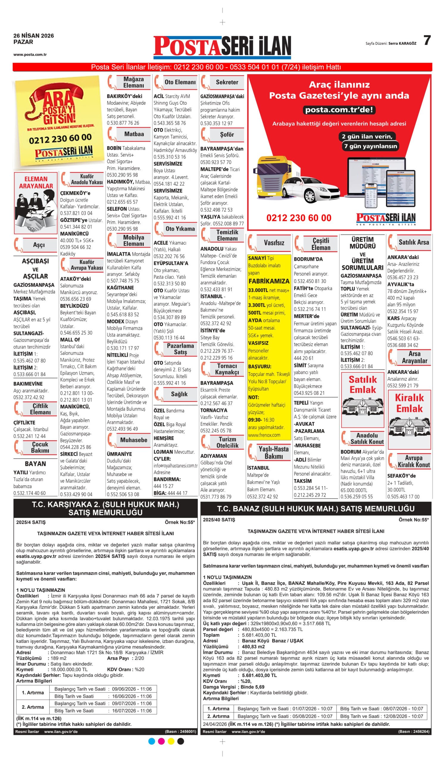 26 Nisan 2026 Posta Bugünkü İş İlanları, Posta Eleman, Posta Kayıp İlanı, Posta Seri İlanlar.