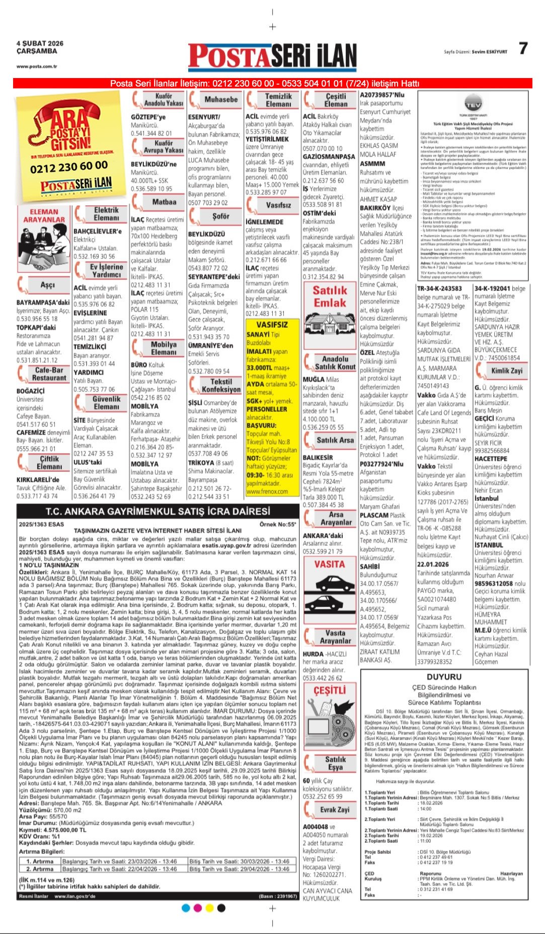 Posta Bugünkü İş İlanları, Posta Eleman, Posta Kayıp İlanı, Posta Seri İlanlar-7.2.2026
