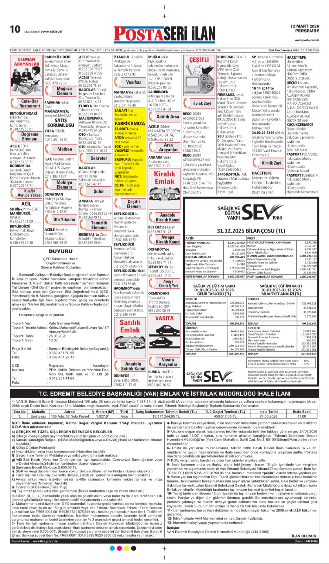 Posta Bugünkü İş İlanları, Posta Eleman, Posta Kayıp İlanı, Posta Seri İlanlar-12.3.2026