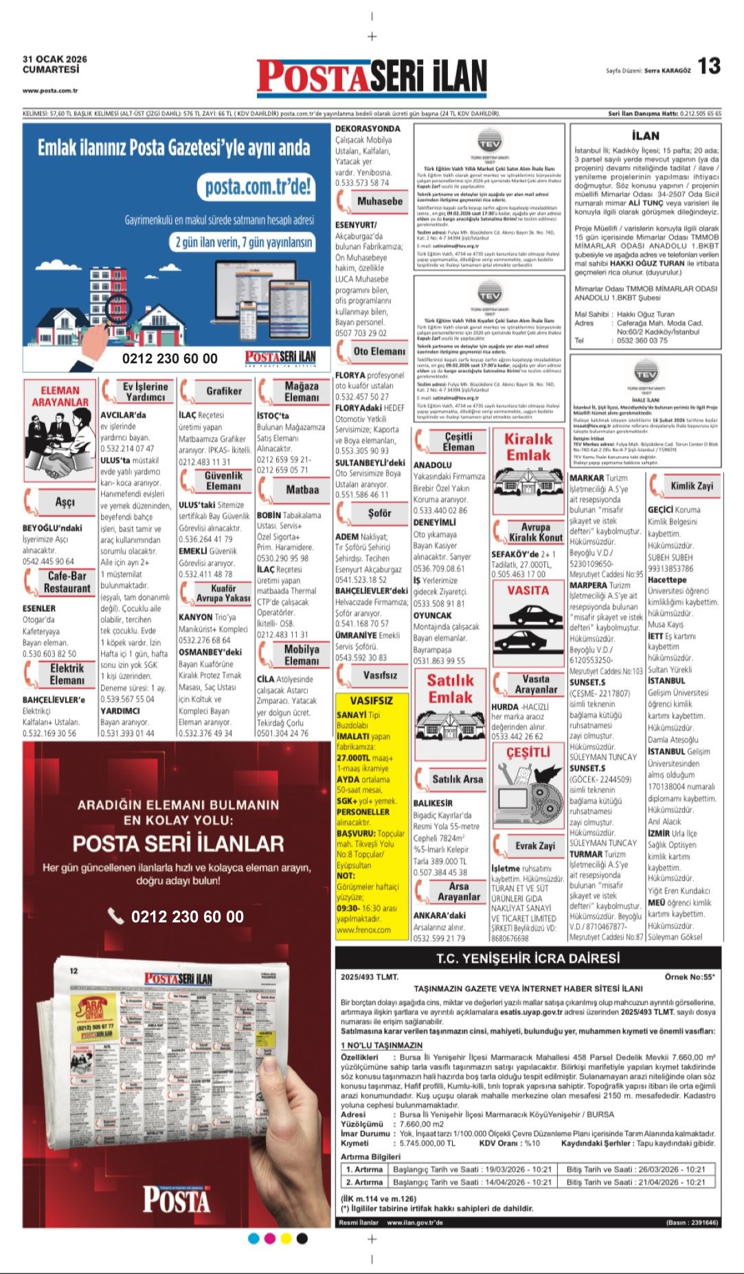 Posta Bugünkü İş İlanları, Posta Eleman, Posta Kayıp İlanı, Posta Seri İlanlar-31.1.2026