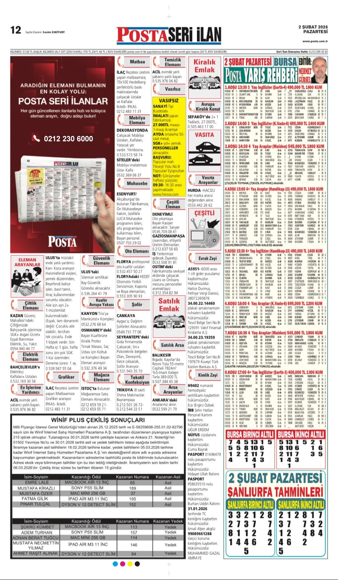 Posta Bugünkü İş İlanları, Posta Eleman, Posta Kayıp İlanı, Posta Seri İlanlar-2.2.2026