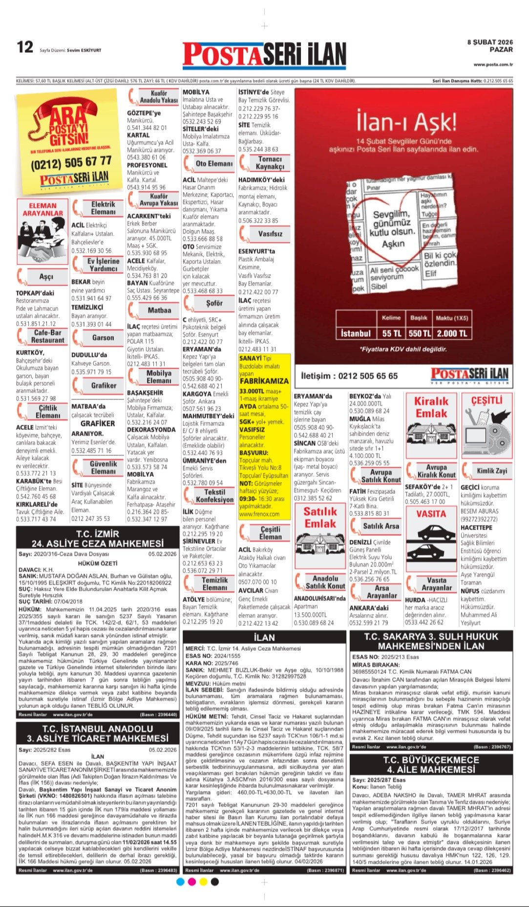 Posta Bugünkü İş İlanları, Posta Eleman, Posta Kayıp İlanı, Posta Seri İlanlar-8.2.2026